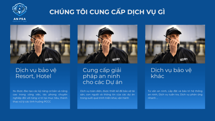Với kinh nghiệm 11 năm trong lĩnh vực an ninh bảo vệ tại các Tập đoàn, khách sạn và các Dự án đã triển khai. Đội ngũ chuyên nghiệp, giàu kinh nghiệm thực tế. Chúng tôi cam kết mang đến khách hàng dịch vụ chất lượng, hiệu quả, cam kết đồng hành cùng khách hàng xử lý dứt điểm các vấn đề liên quan khâu an ninh bảo vệ tại mục tiêu đảm nhận. AN PSA tự hào đã đồng hành cùng nhiều Tập đoàn, doanh nghiệp lớn ( BIM Group, Intercontinental, MIK Group…) tại một số dự án quan trọng.